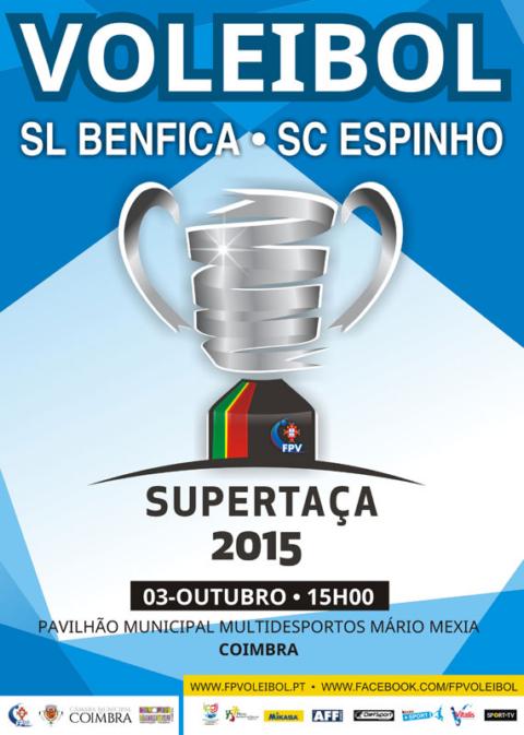 A Supertaça de masculinos 2015 disputa-se no dia 3 de Outubro (15h00) no Pavilhão Municipal Multidesportos Mário Mexia, em Coimbra, numa organização da Federação Portuguesa de Voleibol, com a colaboração da Câmara Municipal de Coimbra e da Associação de Voleibol de Coimbra. Os ingressos têm o preço único de 3 euros e o jogo será transmitido em directo no canal televisivo Sport TV. A 18.ª edição* da Supertaça coloca frente a frente o Sport Lisboa e Benfica, campeão nacional e vencedor das quatro últimas edições da prova, e o Sporting Clube de Espinho, finalista vencido da Taça de Portugal em 2014/2015 e vencedor da Supertaça por quatro vezes. Acreditação dos jornalistas aqui Desde 1988/89 até à actualidade, várias equipas de seniores masculinos rubricaram o seu nome na lista dos vencedores deste troféu disputado pelo campeão nacional e pelo vencedor da Taça de Portugal, com destaque para o Castêlo da Maia GC, que, no seu historial, ergueu o troféu por cinco vezes, e para o SC Espinho e SL Benfica*, com 4 vitórias. O Sporting CP, com três triunfos, e o Leixões SC (1) completam o leque de vencedores. *Em 1989/1990, o SL Benfica venceu a Taça Federação, que foi disputada por várias equipas Mais informações: www.fpvoleibol.pt / http://www.fpvoleibol.pt/supertacadeportugal.html / www.facebook.com/fpvoleibol