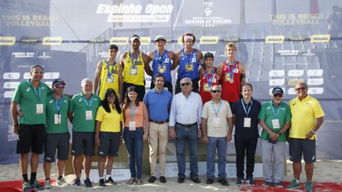 A cidade de Espinho vai voltar a receber a elite do Voleibol de Praia de 17 a 21 de Julho do próximo ano, quando acolher o Espinho Open 2019, etapa de quatro estrelas, o segundo maior nível do Circuito Mundial (FIVB Beach Volleyball World Tour), numa organização da Federação Portuguesa de Voleibol com o apoio e colaboração da Câmara Municipal de Espinho. No Espinho Open 2018, igualmente de 4**** do Circuito Mundial de Voleibol de Praia, as grandes vencedoras foram as duplas Janis Smedins/Aleksandrs Samoilovs (Letónia) e Taliqua Clancy e Artacho Del Solar (Austrália). Nessa 15.ª edição de masculinos, os letões superaram (2-1: 21-13, 19-21 e 22-20) na final os brasileiros Ricardo Santos e Gustavo Albrecht, num jogo que empolgou o público e que perdurará certamente na memória de todos aqueles que lotaram o estádio montado na Praia da Baía, criando uma animação extra num excelente espectáculo de Voleibol de Praia e augurando um futuro promissor à etapa espinhense, após um hiato de 10 anos. Para além do excelente ambiente criado à volta do Espinho Open pelos sponsors e/ou parceiros da FPV, como Honda, Lidl, Hospital de Santa Maria (presentes com Stands na competição), ActivoBank, Kinder + Sports, Mikasa, Vitalis, AFF Sports, 4ntep e, sobretudo, Câmara de Espinho, entre outros, saliente-se o regresso à Capital do Voleibol de Praia de dois ícones da modalidade. O primeiro foi o já mencionado Ricardo Santos, de 43 anos, nome indissociável da competição espinhense. Com 11 presenças no Espinho Open, oito medalhas, sendo cinco de ouro, o brasileiro é já uma lenda viva da história da competição portuguesa e do Voleibol de Praia mundial. A outra personalidade presente foi a inevitável Kerri Walsh Jennings. Aos 39 anos, a norte-americana, de 1.88 metros de altura, é um dos nomes maiores do Voleibol de Praia mundial, tendo sido, entre outros êxitos relevantes, tricampeã olímpica (2004, 2008 e 2012), com Misty May, com quem venceu por duas vezes em Espinho (2001 e 2005).