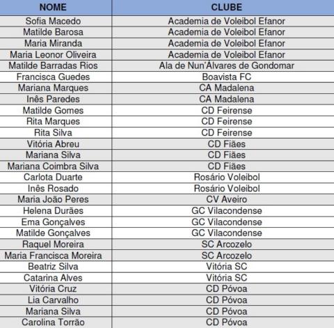 observação. Os treinos de observação da Selecção Nacional de Sub-15 decorrerão nos dias 19 e 20 de Fevereiro, das 19h00 às 21h30, no Pavilhão da Escola Secundária Rodrigues de Freitas. * Ver 1.ª convocatória aqui e 2.ª convocatória aqui Atletas convocadas para observação Treinos regulares de Sub-17 Entretanto, Rui Pedro Silva convocou atletas para treinos regulares da Selecção Nacional de Sub-17 de Femininos, a iniciar no dia 17 de Fevereiro no pavilhão da Escola Secundária Rodrigues de Freitas (segundas e terças-feiras, das 19h00 às 21h30): Matilde Babb (Academia de Voleibol Efanor) e Luna Nunes (Câstelo da Maia GC). Treinos de observação: 1.ª convocatória aqui e 2.ª convocatória aqui
