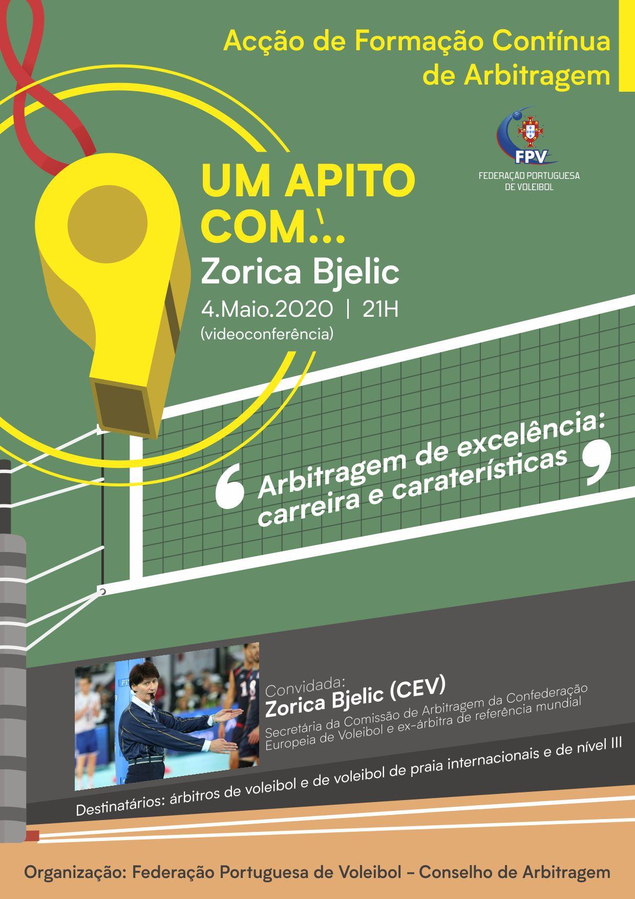 Zorica Bjelic, Secretária da Comissão de Arbitragem da Confederação Europeia de Voleibol (CEV) e uma ex-árbitra sérvia de referência mundial, é a primeira convidada para um ciclo de videoconferências orientado exclusivamente para os árbitros internacionais e nacionais de Voleibol e de Voleibol de Praia, denominado «Um Apito com…».