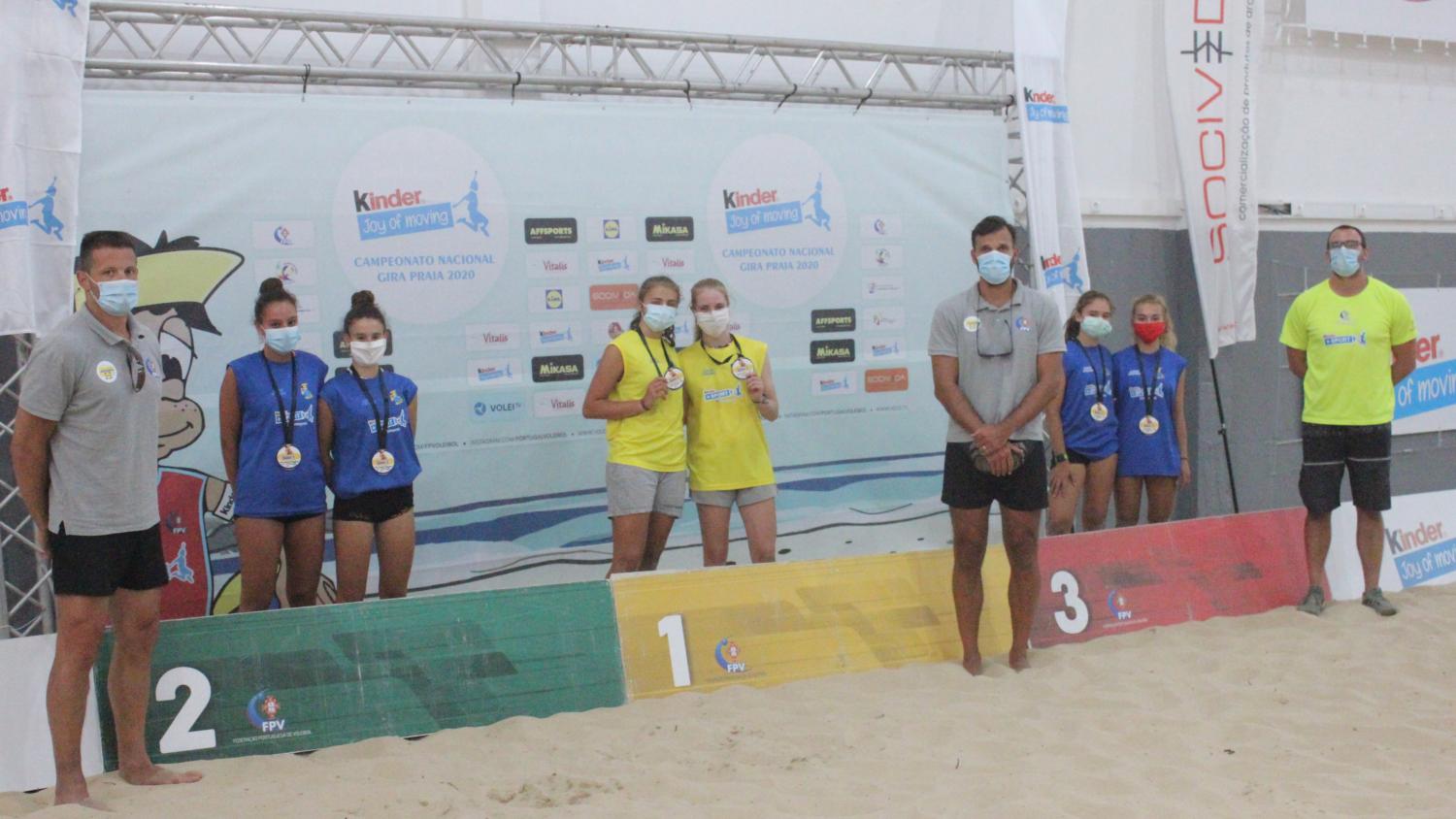 Inês Costa e Beatriz Cerveira são as novas campeãs de Sub-16 femininos em Gira-Praia, cujos campeonatos nacionais estão a decorrer no Centro de Alto Rendimento de Voleibol de Praia da FPV, em Cortegaça, Ovar. Numa final supercompetitiva, Inês e Beatriz superaram (2-1: 13-15, 16-14 e 15-7) Íris Rodrigues e Inês Pereira, impondo-lhes a única derrota em todo o campeonato. No terceiro lugar ficou a dupla Carolina Silva/Mariana Almeida, que se superiorizou, com dificuldade (2-1: 9-15, 15-12 e 15-13), a Mafalda Soares/Clara Fernandes. Amanhã realiza-se o Campeonato de Sub-16 Masculinos. Os Campeonatos Nacionais de Gira-Praia 2020, nas categorias de Sub-14, Sub-16 e Sub-18 masculinos e femininos, disputam-se de 18 a 23 de Agosto no Centro de Alto Rendimento de Voleibol de Praia da Federação Portuguesa de Voleibol (FPV), em Cortegaça, e realizam-se sem público, no estrito cumprimento das regras de segurança sanitária da Direcção Geral da Saúde (DGS). Calendário