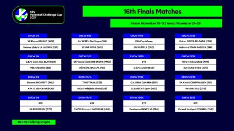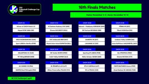 As equipas portuguesas conheceram hoje* os adversários que terão de enfrentar nos 16 avos-de-final da CEV Volleyball Challenge Cup 2021. Em masculinos, SL Benfica, Sporting CP e AJ Fonte do Bastardo vão defrontar, respectivamente, o Vegyesz RC Kazincbarcika (Hungria), o Helios Grizzlys Giesen (Alemanha) e o Ziraat Bankasi Ankara (Turquia), antiga equipa do capitão da Selecção Nacional, Alexandre Ferreira, actualmente a jogar na Coreia do Sul. Os encarnados da Luz e começam por jogar fora de portas (3, 4 ou 5 de Novembro de 2020), recebendo os seus adversários húngaros na semana seguinte (10, 11 ou 12 de Novembro), enquanto a equipa leonina e os açorianos da AJ Fonte do Bastardo recebem primeiro, e respectivamente, os germânicos e os turcos.