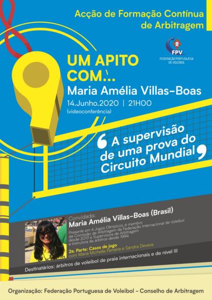 A brasileira Maria Amélia Villas-Boas é a próxima convidada do ciclo de videoconferências denominado «Um Apito com…», organizado pelo Conselho de Arbitragem da Federação Portuguesa de Voleibol (FPV) em colaboração com o Departamento de Formação federativo, cuja sessão vai ter lugar no dia 14 de Junho, pelas 21 horas.