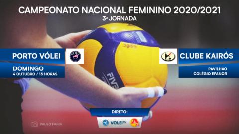 O jogo Porto Vólei x Clube Kairós, da 1.ª Fase do Campeonato Nacional da I Divisão – seniores femininos, realiza-se no dia 4 de Outubro (domingo) e será transmitido em directo (15h00) na Volei TV e A Bola TV.