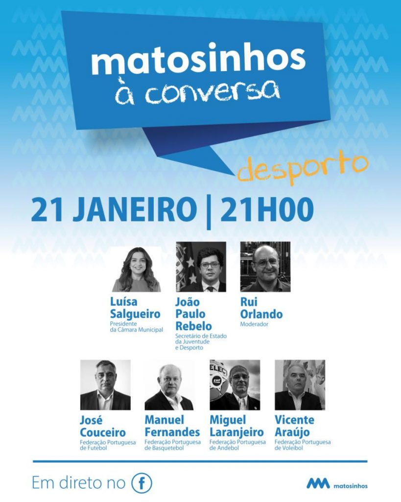 O Matosinhos à Conversa: Desporto, que será moderado pelo jornalista e coordenador da Sport TV no Porto, Rui Orlando, conta ainda com a participação de José Couceiro, da Direcção da Federação Portuguesa de Futebol, Manuel Fernandes, Presidente da Federação Portuguesa de Basquetebol, e de Miguel Laranjeiro, Presidente da Federação de Andebol de Portugal.