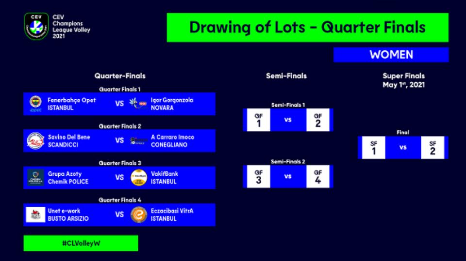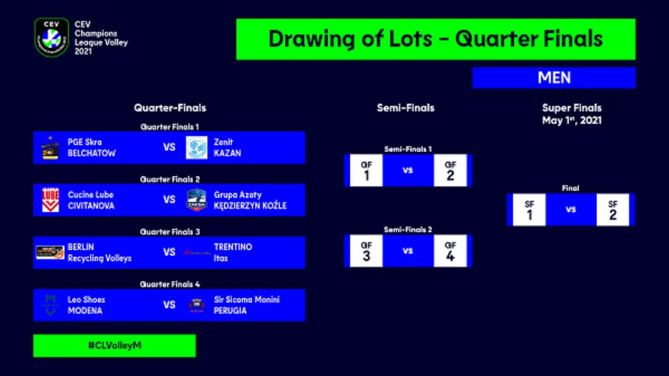 Os polacos do PGE Skra Belchatow vão defrontar os russos do Zenit Kazan, os italianos do Cucine Lube Civitanova medem forças com os polacos do Grupa Azoty Kedzierzyn Kozle, os alemães do Berlin Recycling Volleys enfrentam os italianos do Trentino Itas e os italianos do Leo Shoes Modena têm um duelo agendado com os seus compatriotas do Sir Sicoma Monini Perugia.