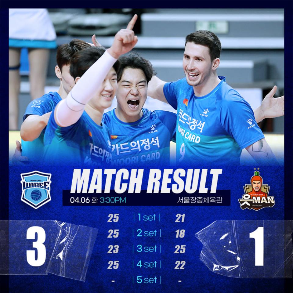Na Coreia do Sul, o Seoul Woori Card Wibee VB, de Alexandre Ferreira, venceu hoje, por 3-1 (25-21, 25-18, 23-25 e 25-22) o Ansan OK Financial Group Okman no primeiro jogo do Play-off das meias-finais da V-League, que contou com a presença de público pela primeira vez.