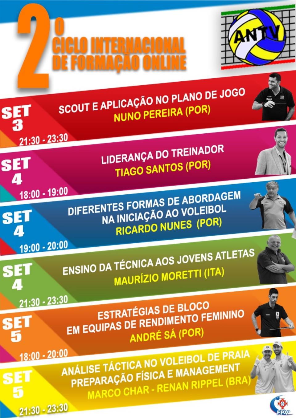 O 2.º Ciclo Internacional de Formação Online (CIFO2) – inserido no processo de formação contínua de treinadores de Voleibol –, organizado pela Associação Nacional de Treinadores de Voleibol (ANTV), em colaboração com a Federação Portuguesa de Voleibol (FPV), arranca esta sexta-feira e prolonga-se até ao dia 12 de Setembro.