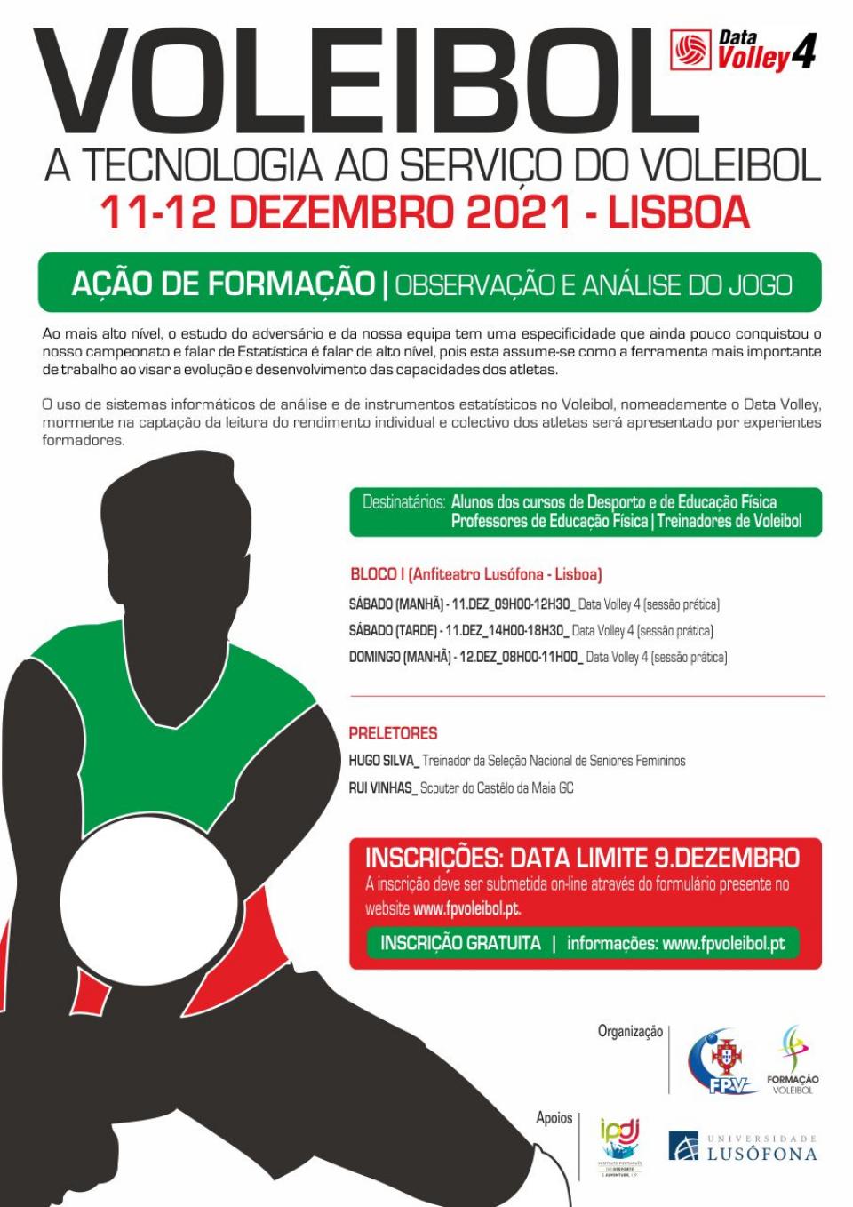 A Federação Portuguesa de Voleibol (FPV) organiza no fim de-semana (11 e 12 de Dezembro), nas instalações da Universidade Lusófona de Lisboa, uma Acção de Formação, Observação e Análise do Jogo que tem como principais destinatários os alunos dos cursos de Desporto e de Educação Física da Univ. Lusófona e os treinadores de Voleibol.