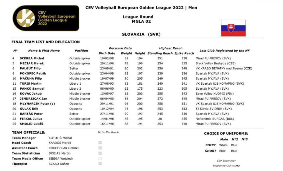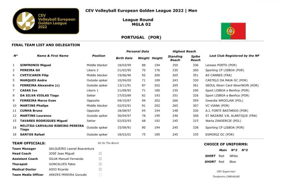 A Selecção Nacional de Seniores Masculinos inicia amanhã (17h00) frente à Eslováquia a disputa da European Golden League 2022 – competição que integra algumas das principais selecções europeias e que dá acesso à denominada Liga das Nações de Voleibol (Volleyball Nations League) de 2023.