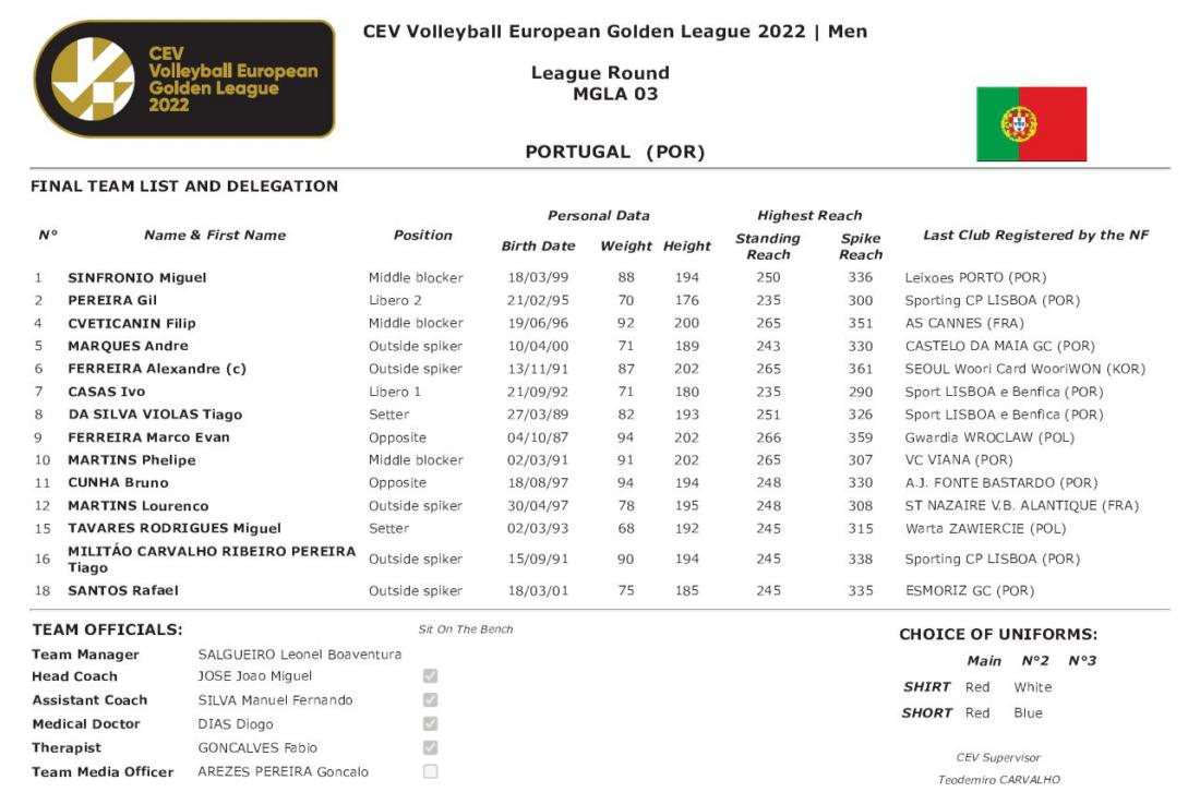 | 29/mai/22 | 17H00 | Portugal x Eslováquia, 3-0 | Golden League | CC V. Castelo |