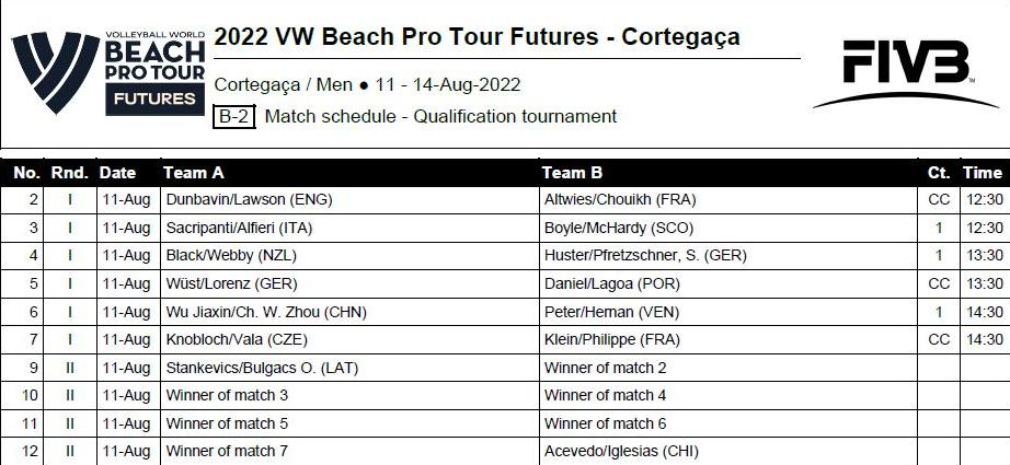 O Beach Pro Tour – Cortegaça Futures arranca amanhã no Centro de Alto Rendimento de Voleibol de Praia (CARVP) da FPV, em Cortegaça, Ovar, já com uma dupla portuguesa em acção: Daniel Pedro/Pedro Lagoá, que enfrenta, pelas 13h30, os alemães Lui Wust e Momme Lorenz na Fase de Qualificação. Ver todas as informações AQUI