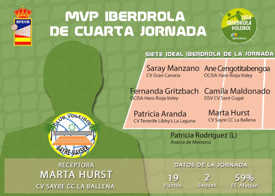 A zona 4 portuguesa esteve em evidência ao ser a MVP (Jogadora Mais Valiosa) da 4.ª jornada, tendo contabilizado 19 pontos (17 ataques, com eficácia de 59 %, e 2 serviços) e integrado o Siete Ideal.
