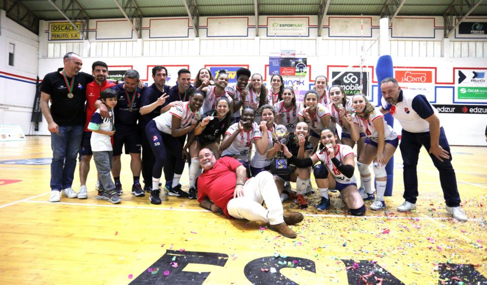 A equipa de seniores femininos do Esmoriz Ginásio Clube conquistou o título de campeã nacional ao assegurar matematicamente o 1.º lugar na Série dos Primeiros após vencer o Dumiense FC por 3-1 (25-10, 22-25, 25-21 e 25-18), em jogo da penúltima jornada da Série dos Primeiros disputado no pavilhão do Esmoriz GC [Foto: Paulo Faria].