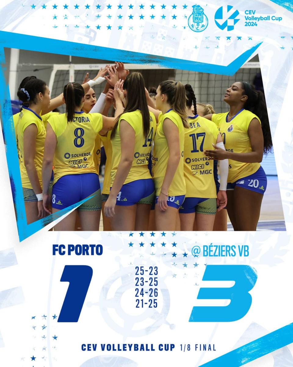 A equipa de seniores femininos do Futebol Clube do Porto foi hoje eliminada da Taça CEV pelas gaulesas do Béziers ao perder por 1-3 (25-23, 23-25, 24-26 e 21-25), em França, no jogo da 2.ª mão dos oitavos-de-final da Taça CEV.