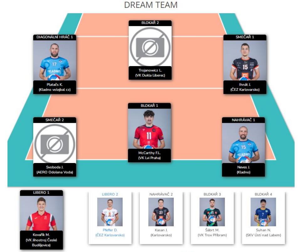Na Chéquia, o Kladno Volejabl cz, de José Neves, recebeu e venceu (3-2: 25-16, 25-13, 27-29, 17-25 e 15-11) o SKV Ústí nad Labem, 13.º e último classificado da Extraliga, com o distribuidor português a rubricar 4 pontos (3 ataques e 1 bloco) e a voltar a marcar presença no Dream Team da jornada.