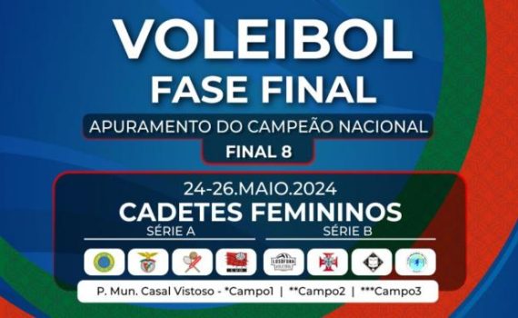 A Final 8 do Campeonato Nacional de Cadetes Femininos realiza-se no Pavilhão Municipal Casal Vistoso, nos dias 24, 25 e 26 de Maio. Todas as informações em https://fpvoleibol.pt/fpv/competicoes/fases-finais-2023-2024/