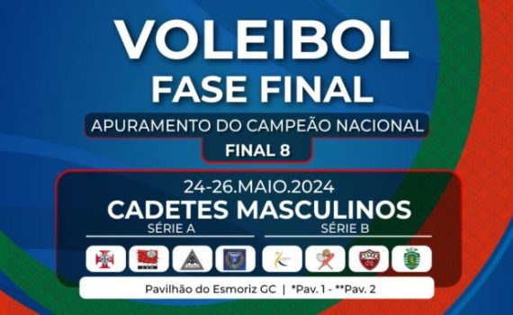 A Final 8 do Campeonato Nacional de Cadetes Masculinos realiza-se no Pavilhão do Esmoriz Ginásio Clube, nos dias 24, 25 e 26 de Maio. Todas as informações em https://fpvoleibol.pt/fpv/competicoes/fases-finais-2023-2024/