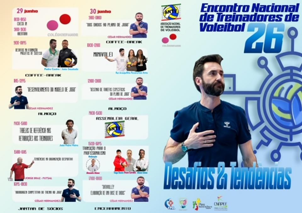 A 26.ª edição do prestigiado evento nacional para treinadores de Voleibol é dedicada ao tema «Desafios & Tendências» e segundo os organizadores, para além do treinador espanhol César Hernandez, que orientou várias equipas de femininos em Espanha, Itália, França, Turquia, Azerbaijão, bem como a selecção da Coreia, contará com um leque de prelectores de renome (ver imagem ANTV) e será moderado por Alexandre Afonso, antigo elemento técnico das seleccões nacionais e campeão nacional pela AJ Fonte do Bastardo na época de 2010/2011. Ver Programa aqui