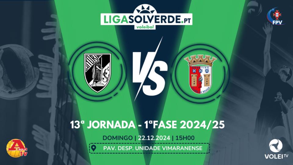 Com as visitas do líder Sporting CP a Fiães e do vice SL Benfica a Vila do Conde, o destaque da 13.ª jornada da 1.ª Fase da Liga Solverde.pt vai para o dérbi minhoto entre as conquistadoras do Vitória SC (8.º) e as guerreiras do SC Braga (3.º), que será transmitido em directo na Volei TV e n’A Bola TV pelas 15h00 do dia 22 de Dezembro (domingo).