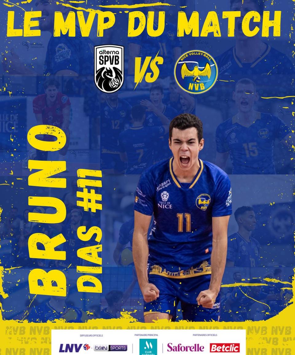 Por seu turno, o Nice Volley-Ball, de Bruno Dias, foi vencer com autoridade (3-0: 25-22, 25-18 e 25-23) a Poitiers, com o distribuidor lusitano a cotar-se como o MVP (Jogador Mais Valioso) do jogo, após rubricar uma boa exibição coroada com 6 pontos (3 serviços e 3 blocos). Imagem: Nice VB