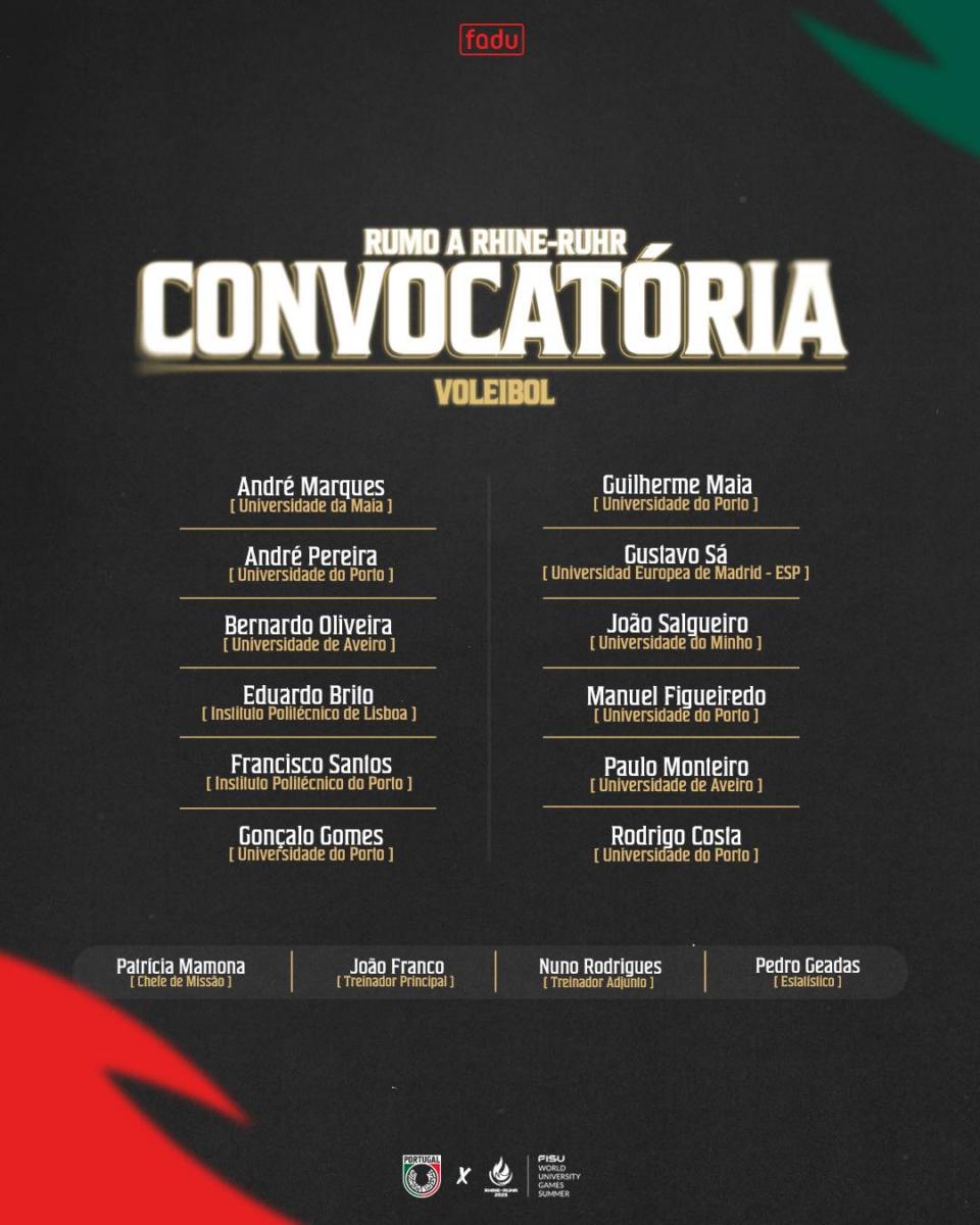 O Voleibol estará em acção até ao dia 24 de Julho – os dias 23 e 24 serão dedicados às finais – e Portugal participa com uma selecção universitária de masculinos [ver imagem], formada de acordo com os critérios divulgados pela Federação Académica do Desporto Universitário (FADU – Portugal) e pela Federação Portuguesa de Voleibol.