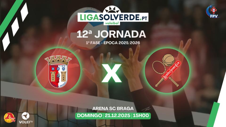Na 12.ª jornada, primeira da segunda volta da 1.ª Fase da Liga Solverde.pt 2025/2026, o destaque vai para o jogo SC Braga (2.º) x Leixões SC (4.º), que será transmitido em directo na Volei TV e A Bola TV e poderá ser seguido, via live streaming, AQUI
