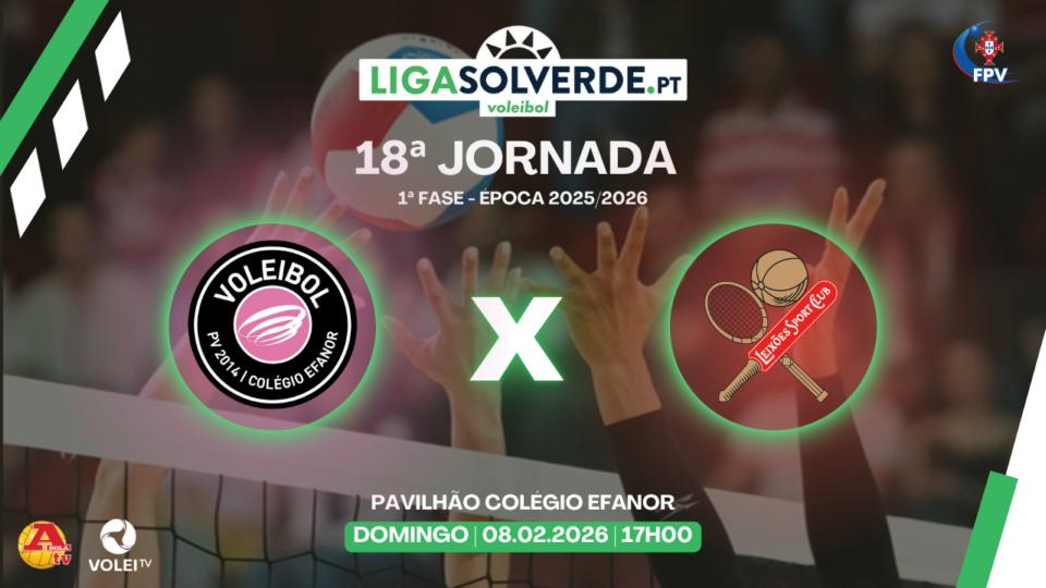 O PV 2014/C. Efanor x Leixões SC, da 18.ª jornada da 1.ª Fase da Liga Solverde.pt 2025/2026, será transmitido em directo na Volei TV e A Bola TV.
