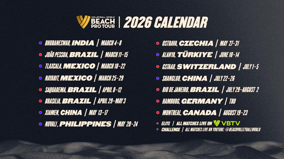 O Brasil continua a afirmar-se como a meca do Voleibol de Praia, recebendo as três primeiras etapas Elite do ano (João Pessoa, Saquarema e Brasília) entre março e maio, além de uma paragem no lendário Rio de Janeiro em julho. Na Europa, os palcos icónicos de Ostrava (Chéquia), Gstaad (Suíça) e Hamburgo (Alemanha) mantêm-se no calendário, enquanto a cidade canadiana de Montreal acolherá a última etapa Elite da temporada em agosto. O circuito passará ainda por destinos no México, China, Filipinas e Turquia.