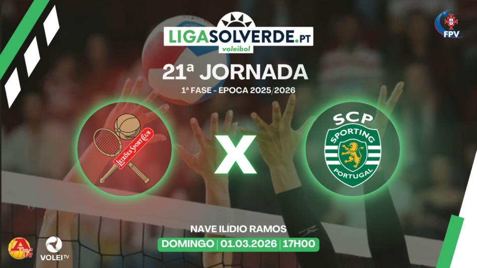 Na 21.ª e penúltima jornada da 1.ª Fase da Liga Solverde.pt 2025/2026 destacam-se dois jogos que poderão provocar alterações no topo da classificação. O SC Braga (3.º) x SL Benfica (4.º) e o Leixões SC (5.º) x Sporting CP (1.º). Este último será transmitido em direto na Volei TV e A Bola TV e poderá ser seguido, via live streaming, AQUI