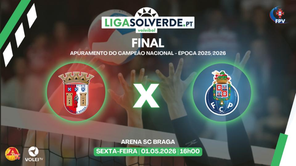 O Sporting Clube de Braga x Futebol Clube do Porto, segundo jogo do Playoff da Final da Liga Solverde.pt 2025/2026, será transmitido em direto na Volei TV e A Bola TV.