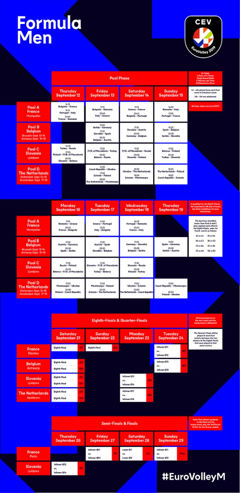 Grécia e Roménia. Pela primeira vez na história da competição, o EuroVolley contará com 24 selecções participantes, incluindo as que representam os quatro países anfitriões – França, Eslovénia, Bélgica e Holanda –, ou seja, oito apuradas pela classificação final do Europeu 2017, 12 da fase de qualificação e 4 organizadores. Informações adicionais: www.cev.lu / eurovolley.cev.eu